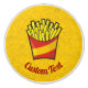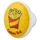 Cartoon illustration of small pack of french fries. Junk food outline icons yellow pattern background. Custom text.