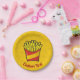 Cartoon illustration of small pack of french fries. Junk food outline icons yellow pattern background. Custom text.