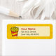 Cartoon illustration of small pack of french fries. Junk food outline icons yellow pattern background. Custom text.