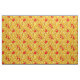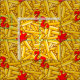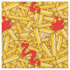 Novelty fabric printed with a pattern of French fries, splashed with red sauce. Perfect for anyone who loves fast food.