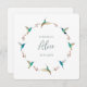 This beautiful baptism invitation is featuring a watercolor wreath of Rufous-tailed, Violet-eared and Broad-billed Hummingbirds and botanical elements on a white background. The font size and font style can be changed by clicking on "Edit this design". All hummingbird images are taken from original watercolors by C. Dobbins.
