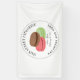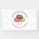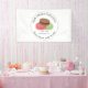 Circle logo with chocolate, pink, and green macarons with custom text for business name, address, and tagline with grey border.