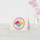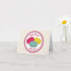 A notecard featuring an illustration of three French macarons (pink, blue, and yellow) inside a decorative pink and blue circle with pink text "Bonjour" and "Hello." Blank inside.
