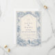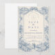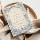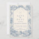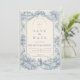 A refined blue toile wedding design inspired by classic French countryside engravings. Delicate pastoral scenery, manicured gardens, stone pathways, and blooming florals frame the lower portion in intricate monochromatic blue linework. The soft ivory sky wash keeps the upper area luminous and balanced, creating a timeless and sophisticated composition. Perfect for a romantic estate, garden, or European-inspired wedding celebration.