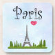 Coasters with a whimsical drawing of the Eiffel Tower surrounded by green trees and pink watercolor heart floating in the air. Light blue background.