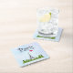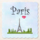 Paper coasters with a whimsical drawing of the Eiffel Tower surrounded by green trees and pink watercolor heart floating in the air. Light blue background.