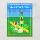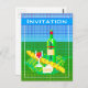 This pixel art drawing shows emblematic food of France like baguette, camembert cheese and red wine. Text to personalise : invitation. Main colours of the design : blue and green.