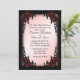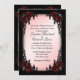 Amazingly beautiful and unique gothic / Victorian design wedding invitation. An iron scrolled rose ensconced frame complete with black candelabra. This is just one of the colours available for a pink or rose colour scheme Goth wedding. Add the name of bride and groom on back along with the date.