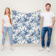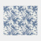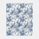 Stylish blue and white French Toile style fleece blanket pattern features peacocks on branches.