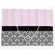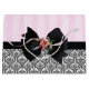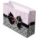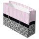 Large glossy gift bag with an image of pink-on-pink stripes on the top half and a black and white traditional French baroque design on the bottom half divided by a black ribbon topped with a black bow with pink rose and ribbon detail. See the entire Birthday Gift Bag collection in the PARTY FAVORS section.
