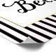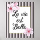 This feminine, chic poster contains the French phrase "La vie est Belle", or "Life is Beautiful" in black elegant script with a faux gold foil thin frame. The border of the poster made of Parisian black and pink stripes, and beautiful illustrated cherry blossoms decorate the corners.