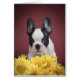 Frenchie - French bulldog puppy withe yellow flowers on red background