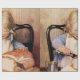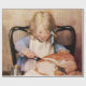 Jessie Willcox Smith was an American artist known for her idyllic imagery of childhood. She was the cover illustrator for the magazine Good Housekeeping for 15 years.A young girl with blonde hair is sitting at a table, cutting into a large loaf of bread. She is wearing a blue dress and a white apron, with a metal cup beside her. This painting is called “Fresh Bread”.