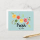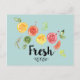 A postcard with a cute design featuring tumbling citrus fruits - lemons, limes and grapefruits. Trendy typography says "Fresh" with a cute squiggly underline.