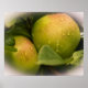 A delightful photograph of a pair of apples still on the tree, nestled amongst their green leaves. Raindrops cover their skin. The apples are ripening and have a nice mixture of shades ranging from bright green to orange and red. A fresh looking nature photo with a soft misty border giving it a dreamy quality.