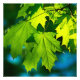 Fresh green maple leaves illuminated by sunlight. Some beams of light manage to break through the thick foliage and make an awesome play of lights and shadows.