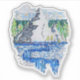 Depicting a serene landscape, the mountain rises majestically with its reflection mirrored in the tranquil lake beneath. Surrounded by lush green trees and a pale sky with a passing cloud, the scene evokes a sense of peace and natural beauty. The use of bold outlines gives the image a whimsical, almost cartoonish feel.