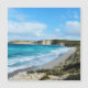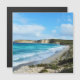 Pictured is a long view of aqua blue sea waters breaking onto white sand with views of high cliffs and lush vegetation