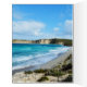 Pictured is a long view of aqua blue sea waters breaking onto white sand with views of high cliffs and lush vegetation