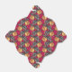 The original artwork on this Take Out Favour Box is a pattern made from an original illustration by ZoeSPEAK of a peach just picked from the tree, with soft green leaves still attached. The golden yellow fruit, with an orange blush on its curves, is arranged in vertical rows along vertical stripes of white and peach pink. The background of the wallpaper pattern is terracotta red, making a warm, colourful fabric design with a country feel.