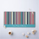Stripes in fresh summer colours including shades of cranberry pink, cyan blue, almost black-blue, contrasting bright orange and white in irregular stripes with different widths set vertically. Personalise with your name or message in white font lettering set on a bright blue.