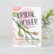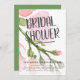 A fresh and modern bridal shower invitation featuring a large pink and green watercolor floral branch, overlaid with the phrase "bridal shower" in dark grey brush lettered font, and details of the event in modern font. The reverse is in solid green overlaid with an overlapping circle pattern.
