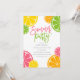 This summer party invitation features the phrase "summer party" in a pink and green modern handwritten script. Pink, green, orange and yellow citrus fruit surround the outer edges of the invitation. Graphics ©MareeTruelove