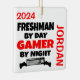 This ornament featuring the quote "Freshman by Day Gamer by Night" is perfect for any freshman that loves playing video games.