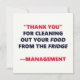 Remember when you cleaned out your food from the fridge? Management wants to thank you with this greeting card as a firm incentive to be careful about your homemade lunches, which do leak a little.