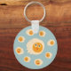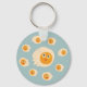 Cute fried eggs kids keychain with a funny vector illustration of happy egg characters over light blue background.