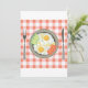 A favourite of most people is fried eggs. This design is some very tasty looking fried eggs on a place. Next to the plate is a knife and fork and the plate is sitting on a chequered table cloth. These fried eggs look particularly good. This fried eggs on a plate design looks great on these invitations