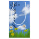 Friend text daisy graphic in green grass and summer flowers with sky background