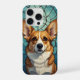 Charming digital illustration of a Pembroke Welsh Corgi with big ears set against a blue stained-glass mosaic background, conveying warmth, playfulness and loyal companionship for pet, design, and editorial use.