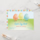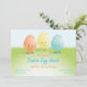 A Easter Egg Hunt invitation with a horizontal layout with three, smiling, Easter egg characters. The friendly Easter eggs are standing outside on green grass. All of the invitation's words can be customised.