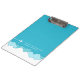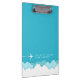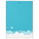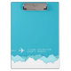 A bright and vibrant turquoise clipboard tailored to the airline pilot, flight instructor, or aviation engineer. It features a bright turquoise theme with a miniature aeroplane soaring over clouds on the bottom edge. Next to this miniature plane and above the clouds is the recipient's name in white. It works as a fun and thoughtful gift for someone who works in or loves the business of aviation.