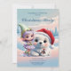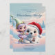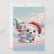 Friends in a fantasy world. Cute baby polar bear with big, curious eyes. Its soft, white fur shines in the winter sun, little elf and a cute bird are looking forward to the Christmas season.