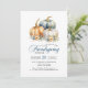 Elegant watercolor thanksgiving FRIENDSGIVING dinner invitation cards. Blue teal, gold orange, white colours with three pumpkins and flowers arrangement. Perfect for that rustic fall autumn holiday season. Invite your family, friends, co-workers, neighbours, guests...All text, colour and size are editable. See the 'FALL IN LOVE Blue Gold orange pumpkins' collection for other items.