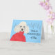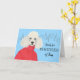 Add your own message or text to the cover. Friendship greeting card for a friend features a classy white poodle wearing a red jacket with a city outline in the background. Ready for Poodles of Fun written on the cover. Art, image, and verse copyright © Shoaff Ballanger Studios, 2025.