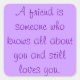 A quote by Elbert Hubbard that says “A friend is someone who knows all about you and still loves you.” On a purple background in purple script. Change the background and script by using the Customise It feature and the Edit button or the font colour selector.