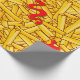 Hilarious cartoon wrapping paper patterned with French fries splattered with red ketchup.