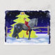 This artwork depicts a winter night scene with a Friesian horse performing the Spanish walk in front of a bright Christmas tree while a dove drapes a red holiday ribbon across his back.