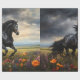 A striking black Friesian horse galloping amidst vibrant wildflowers, with a dramatic stormy sky backdrop adding a sense of power and elegance.