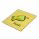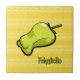 A yellow-green friggitello chilli pepper, also known as a Greek golden pepper or, in the US, pepperoncini when pickled, is decorated with patterns inspired by designs on ancient Greek amphorae and sits on a yellow background with a smaller version of the same pattern and a script label in the corner. This mild pepper was originally cultivated in Italy and is eaten throughout Europe and the United States.