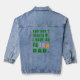 Denim jacket with green distressed letters reading, YOU DON'T FRIGHTEN ME. I HAVE AN IRISH DAD. IRISH shows in the colours of the flag. Fun for family reunions or anytime.