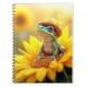 A cute frog wearing a small hat sits atop a bright yellow sunflower, surrounded by a blurred background of similar flowers