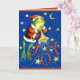 The image on this card was adapted from a vintage postcard. It shows a colourful frog dressed as santa and playing a trumpet. It is also personalised for a birthday on December 25.