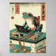 One of the most famous ukiyo-e prints of a frog is "Saru to Kaeru" (Monkey and Frog) by Katsushika Hokusai. This print shows a monkey and a frog playing together in a pond. The monkey is balancing on a lily pad, while the frog is swimming below. The print is full of humour and whimsy, and it captures the playful nature of both animals.