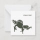 Frog silhouette personalised note card. Frog on front bottom left, text field top right aligned. Back text at centre. White with dark green text.
