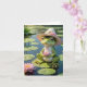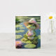 A frog wearing a straw hat adorned with flowers sits on a lily pad with pink water lilies and lily pads surrounding the frog in a serene pond for blank note cards.