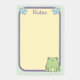 Cute notes with a kawaii, cartoon, green frog in the bottom right corner. At the top of the notes are two happy blue stars either side of the word Notes that is in a light pastel purple colour. The area for writing your notes is in a pastel yellow with a pastel purple border. the background is a pastel green with small white polka dots. Ideal to add to your kids school supplies.